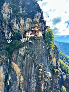 Honestly, nothing prepares one for Bhutan. It is stunningly beautiful with snow-capped mountains, lots of forest, very little industry, no "Western" stores or eateries (I mean none whatsoever), people dressed traditionally, and lots of Buddhist overlay. No one speeds or leans on their horn. There are some wild dogs, but they all look like they just came from the groomer and are vaccinated for rabies. We traveled with Karma and Sunil for about a week, and I had requested some birding, so that was a constant theme. We did four hikes of varying difficulty, with the last day dedicated to climbing Tiger's Nest outside of Paro (5 hours total). Everywhere there were prayer flags, stupas, statuary, and characteristic buildings. Really beautiful country! The only downside of traveling in Bhutan is the many Indian families who drive over for vacation in large family groups; they take up a lot of psychic space.